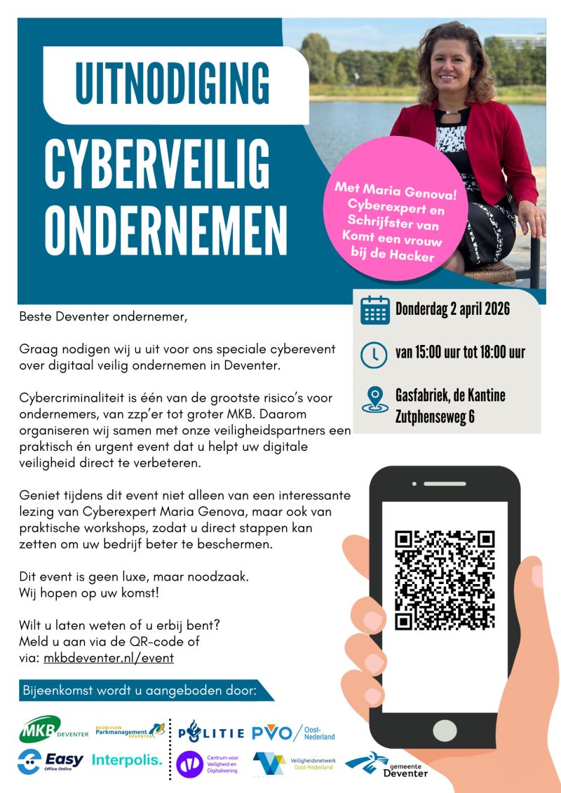 Cybercriminaliteit is één van de grootste risico's voor ondernemers, van ZZP'er tot groter MKB. Daarom organiseren wij samen met onze veiligheidspartners een praktisch én urgent event dat u helpt uw digitale veiligheid direct te verbeteren. Geniet tijdens dit event niet alleen van een interessante lezing van Maria Genova, maar ook van praktische workshops, zodat u direct stappen kunt zetten om uw bedrijf beter te beschermen. Dit event is geen luxe maar noodzaak! Aanmelden kan via de QR-code of via: https://mkbdeventer.nl/event/cyberveilig-ondernemen-ben-jij-goed-voorbereid-save-the-date/