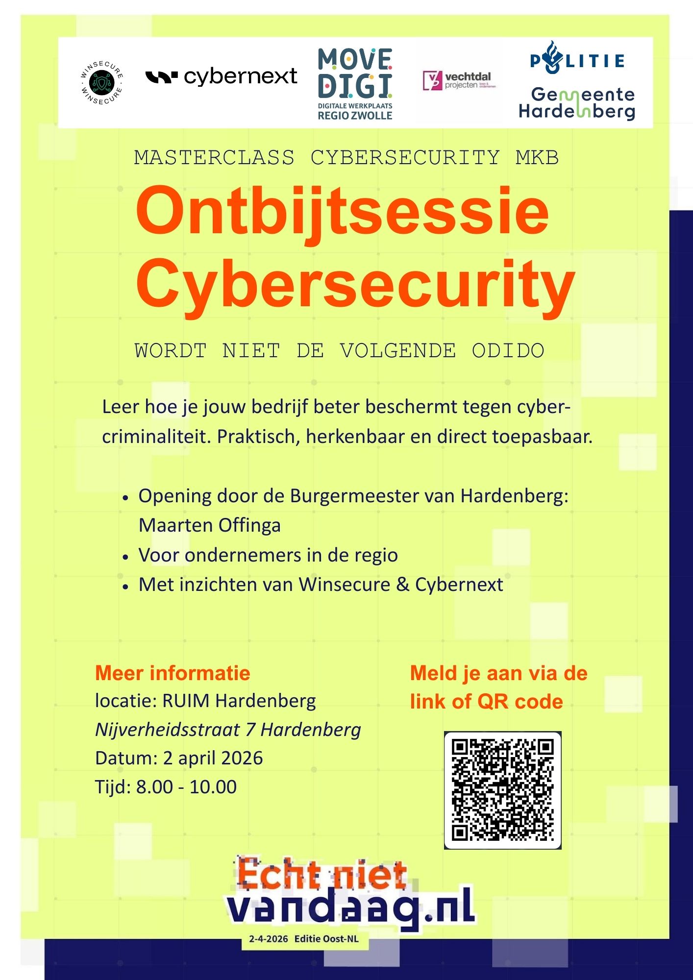 Wordt niet de volgende “Odido”. Cyberincidenten raken allang niet meer alleen grote organisaties. Juist in het MKB kan één klik grote gevolgen hebben. Daarom organiseren we de Ontbijtsessie Cybersecurity (Masterclass Cybersecurity MKB): praktisch, herkenbaar en direct toepasbaar. Je gaat naar huis met concrete maatregelen die je meteen kunt doorvoeren in jouw organisatie. ✅ Voor ondernemers in de regio ✅ Geen jargon, wel actie ✅ Direct verbeterpunten voor je digitale weerbaarheid